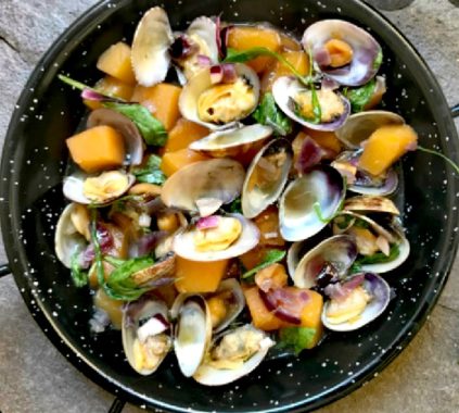 - Añadir las almejas con un poco de vino blanco y perejil. Una vez abiertas, añadir la calabaza troceada, tapar y dejara fuego lento unos minutos.